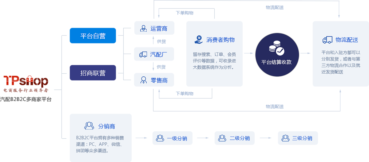 针对当下汽配电商行业的痛点和传统4S店销售模式的优势,以“B2B2C+O2O”的理念建立了由“PC+APP+WAP+微信端”组合的汽车电商全渠道生态体系。